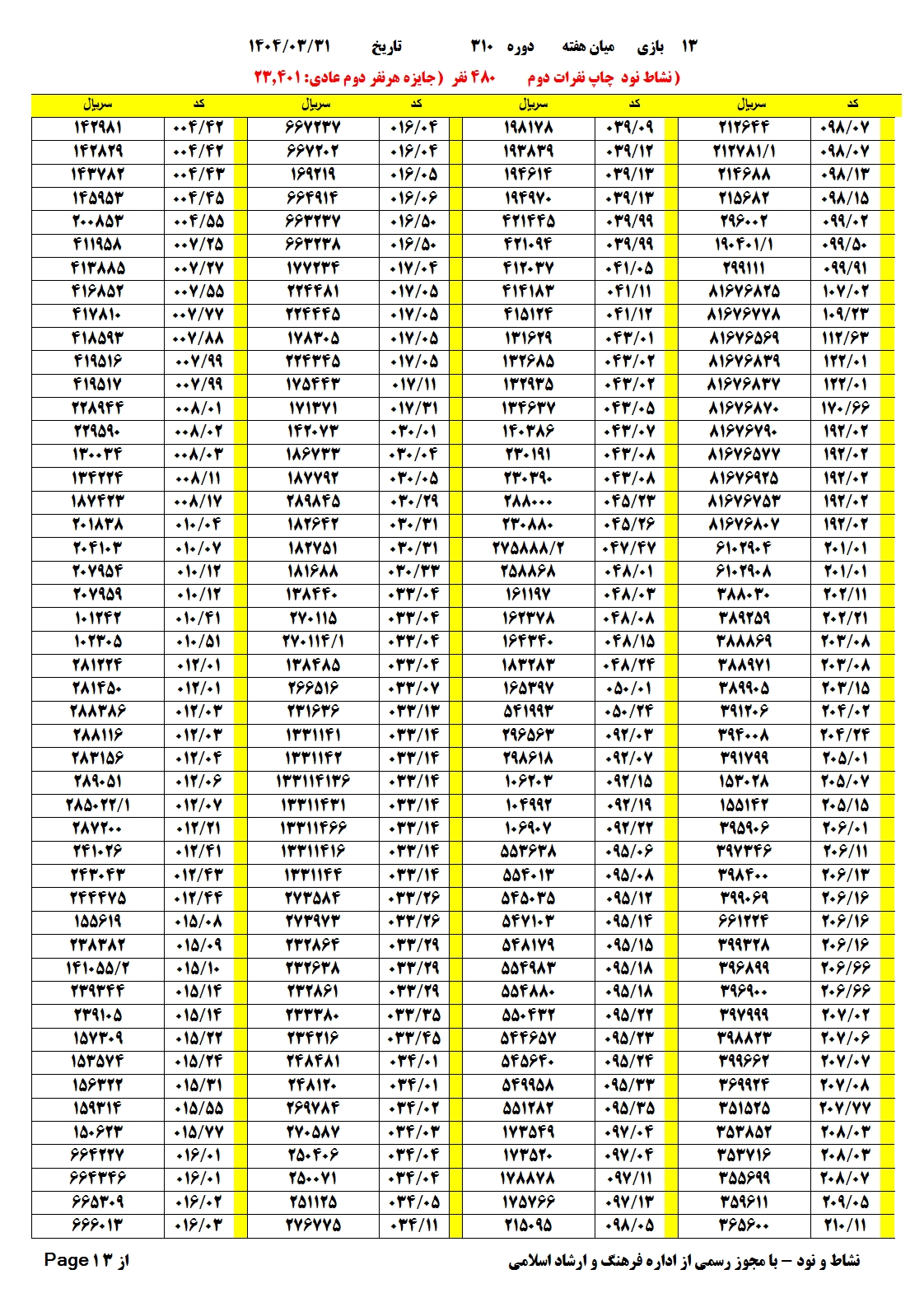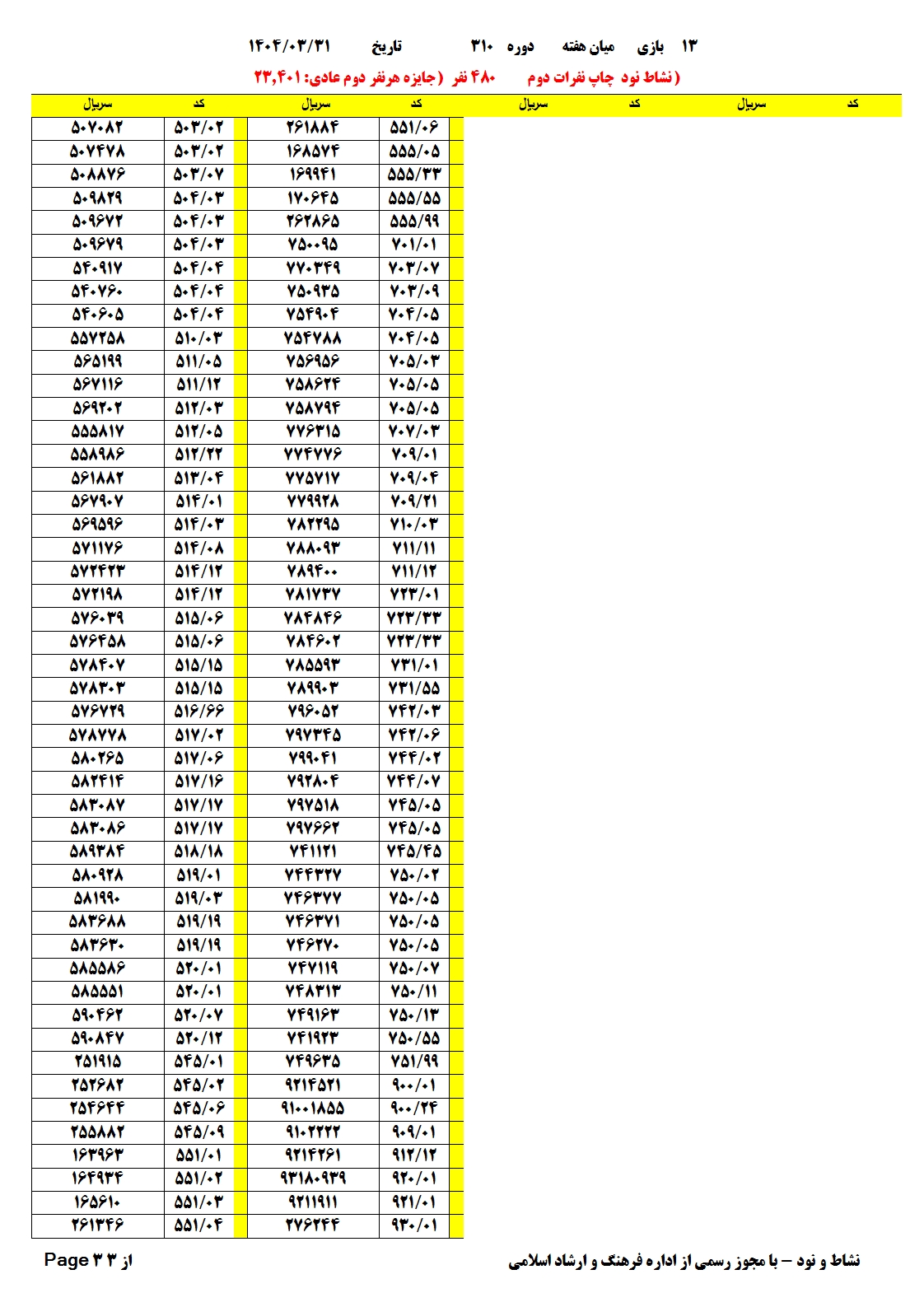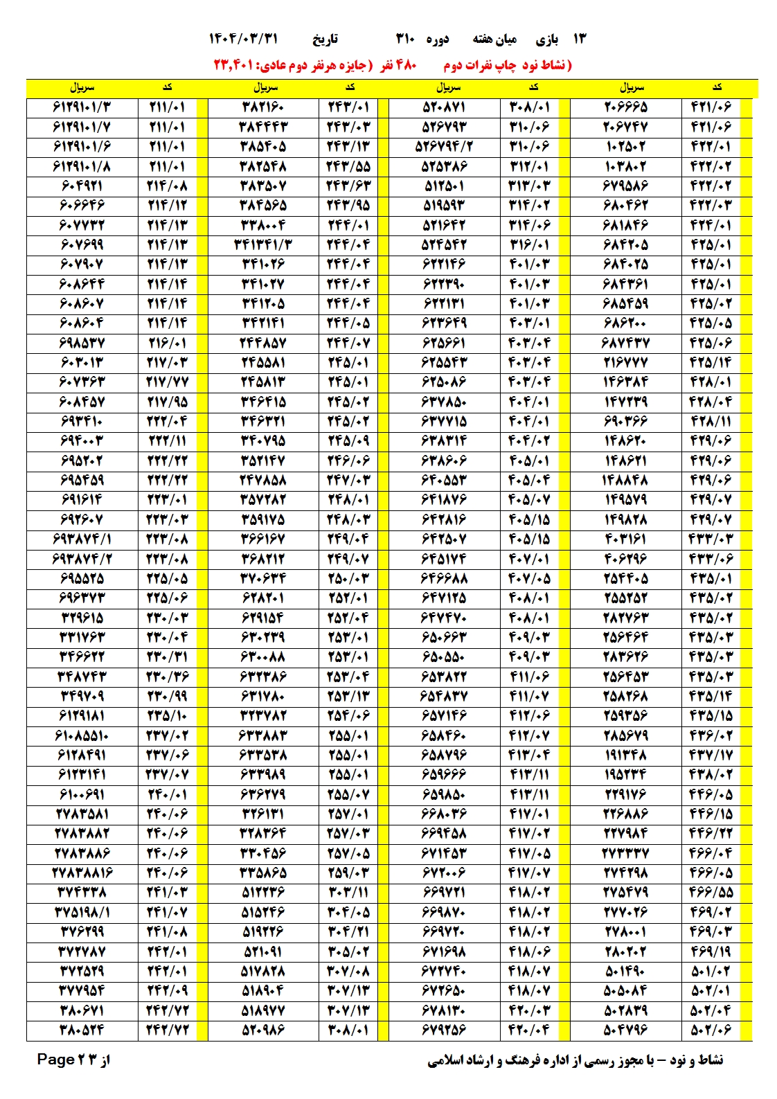 قابل توجه نمایندگان و شرکت کنندگان گرامی! آخرین مهلت ثبت فرم در اپلیکیشن ها و ارسال فایل تا ساعت 17:15 روز سه شنبه 27 خرداد می باشد. --------------------------------------- لینک دانلود آلبوم دیجیتال نشاط 13بازی دوره 306 لیست برگشتی --------------------------------------- تعداد کل شرکت کنندگان 49848 جمع کل هدایا 339.831.450 تعداد بازیهای انجام شده: 13 بازی لیست برندگان دوم | ||||||||