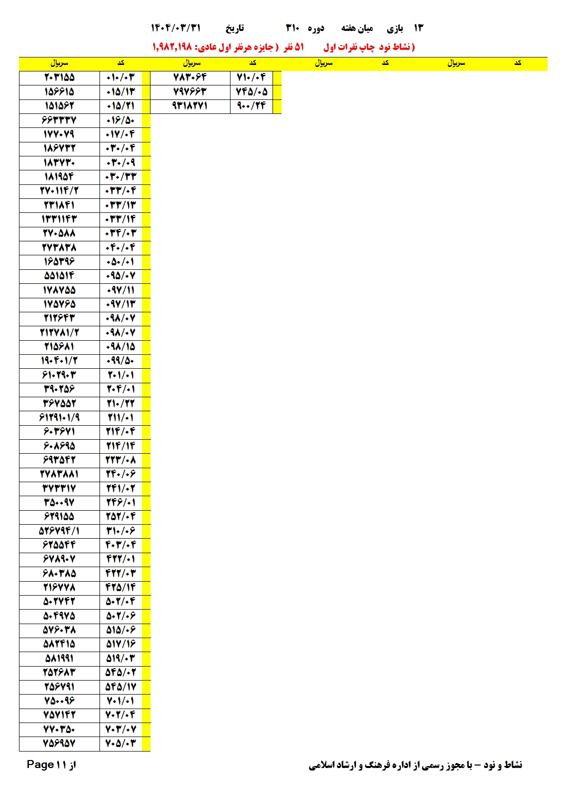 قابل توجه نمایندگان و شرکت کنندگان گرامی! آخرین مهلت ثبت فرم در اپلیکیشن ها و ارسال فایل تا ساعت 17:00 روز یکشنبه 25 خرداد می باشد. --------------------------------------- لینک دانلود آلبوم دیجیتال نشاط 13بازی دوره 304 لیست برگشتی --------------------------------------- تعداد کل شرکت کنندگان 41067 جمع کل هدایا 368.989.950 تعداد بازیهای انجام شده: 13 بازی لیست برندگان دوم | ||||||||