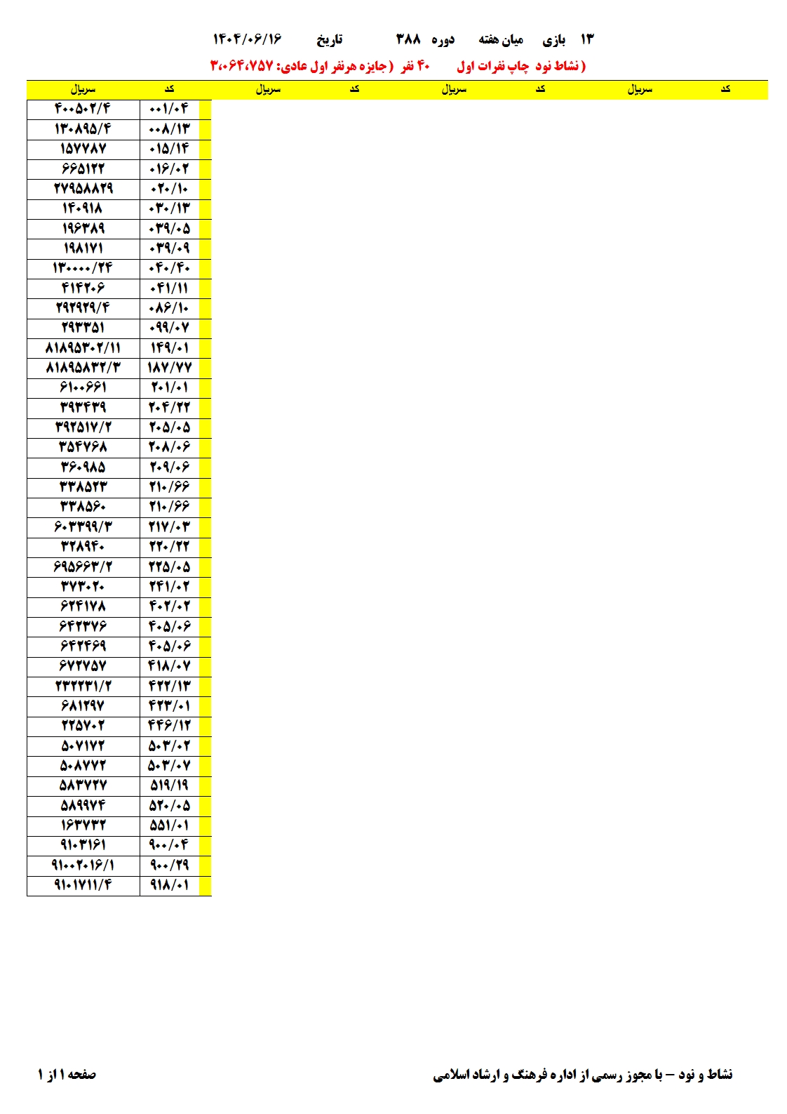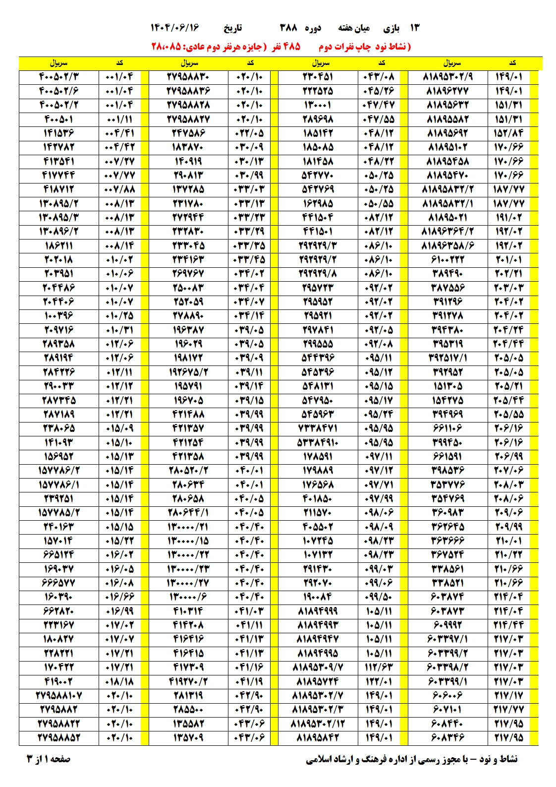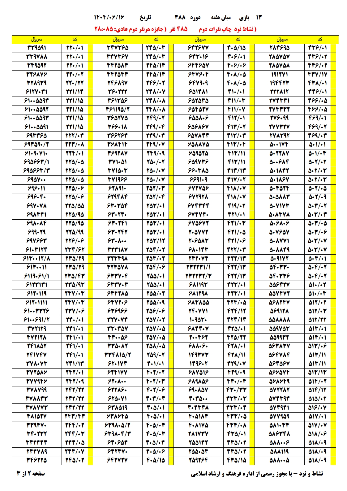 قابل توجه نمایندگان و شرکت کنندگان گرامی! آخرین مهلت ثبت فرم در اپلیکیشن ها و ارسال فایل 13بازی دوره 377 تا ساعت 17:15 روز چهارشنبه 5 شهریور می باشد. --------------------------------------- لینک دانلود آلبوم دیجیتال نشاط 13بازی دوره 377 لیست برگشتی --------------------------------------- تعداد کل شرکت کنندگان 30021 جمع کل هدایا 216.085.710 تعداد بازیهای انجام شده: 13 بازی لیست برندگان دوم | ||||||||