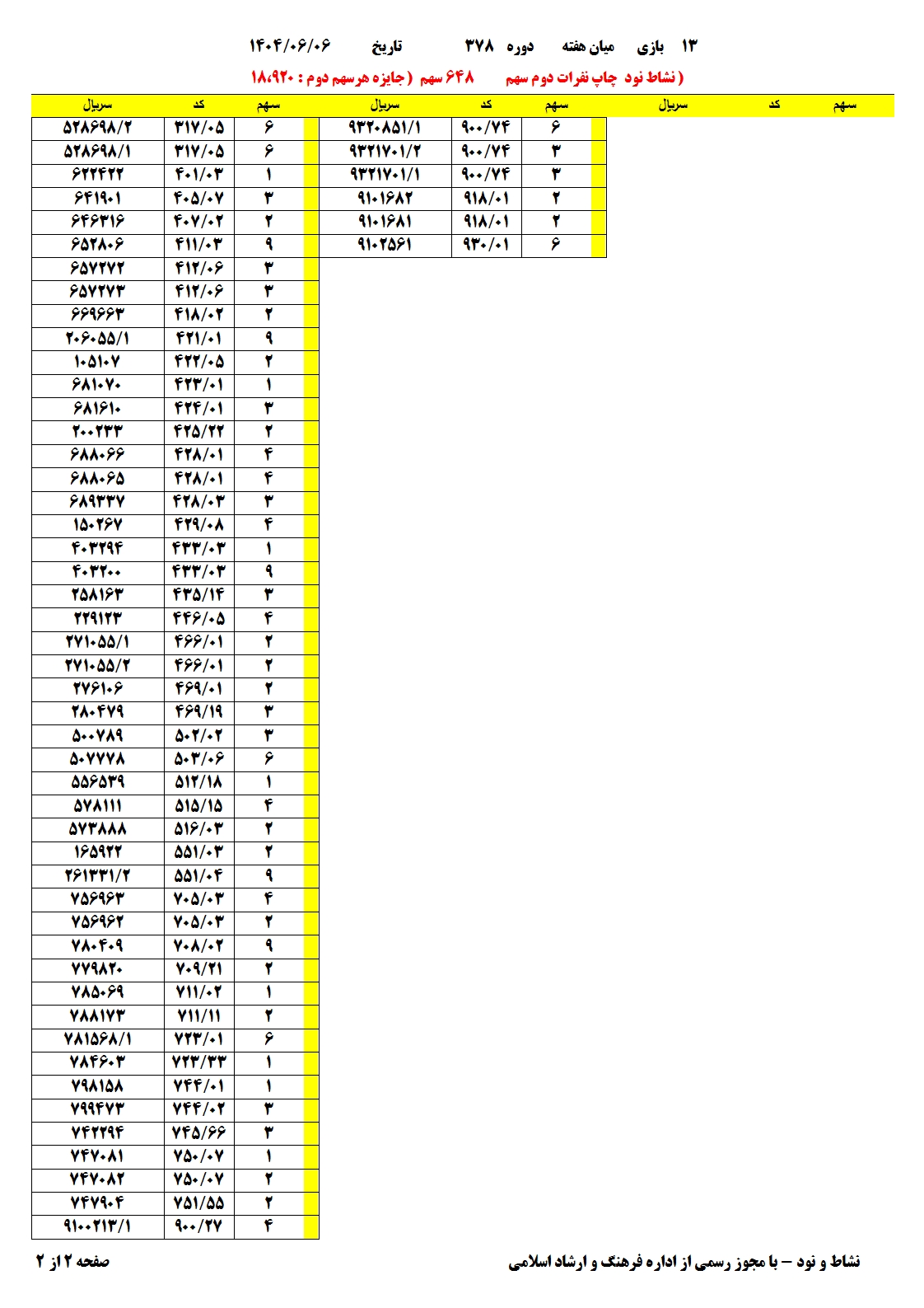 قابل توجه نمایندگان و شرکت کنندگان گرامی! آخرین مهلت ثبت فرم در اپلیکیشن ها و ارسال فایل 13بازی دوره 378 تا ساعت 18:15 روز پنجشنبه 6 شهریور می باشد. --------------------------------------- لینک دانلود آلبوم دیجیتال نشاط 13بازی دوره 378 لیست برگشتی --------------------------------------- تعداد کل شرکت کنندگان 17235 جمع کل هدایا 204.331.170 تعداد بازیهای انجام شده: 11 بازی تعداد 90 سهم تعداد 648 سهم